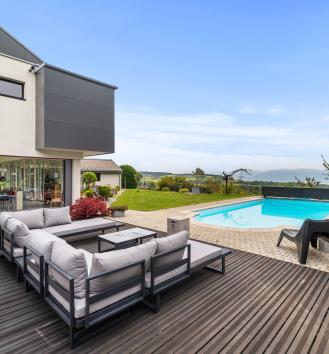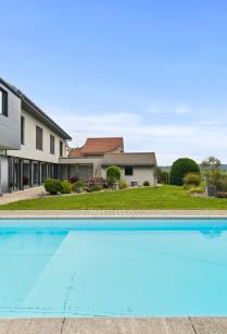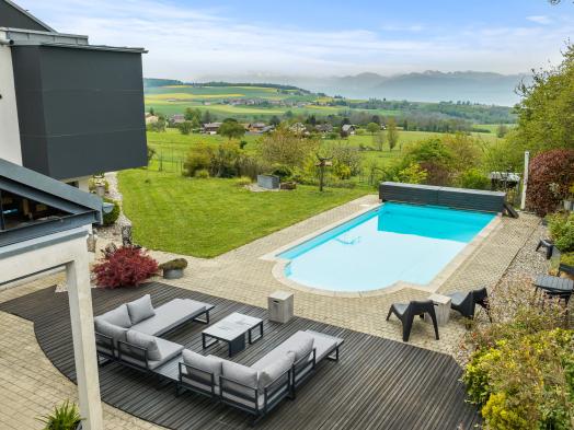 This superb contemporary-style family home was built in 2001 and offers unobstructed views of the surrounding countryside, the lake and the Alps. Located on the edge of the village, it offers quick access to the shops and benefits from a quiet, bucolic setting. The 330sqm house has been built on a plot of over 1400sqm, so you can enjoy the garden and terrace all year round. Very pleasant to live in, with fluid circulation, each of the two levels offers beautiful spaces. On the ground floor, there are several lounges, a billiard room and a lovely study. The kitchen opens onto a beautiful dining room and the pergola, which houses a summer dining room opening onto a large terrace and the swimming pool. The first floor features a large master suite, three children's bedrooms, a bow window with an office space and a laundry room.