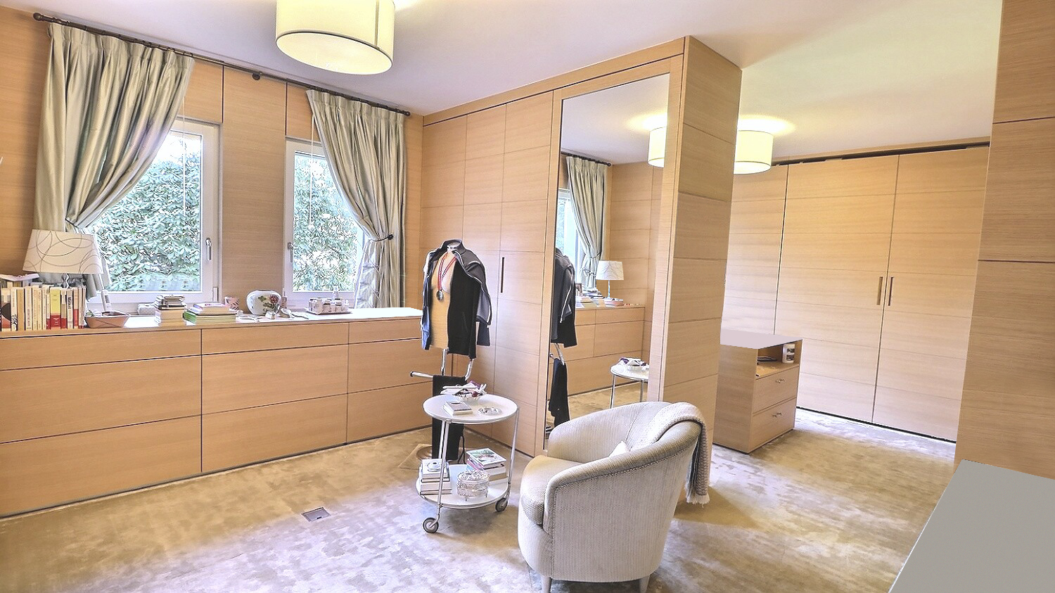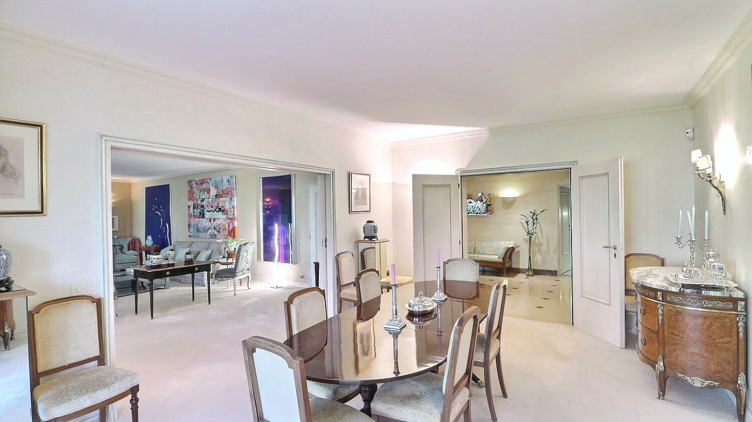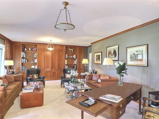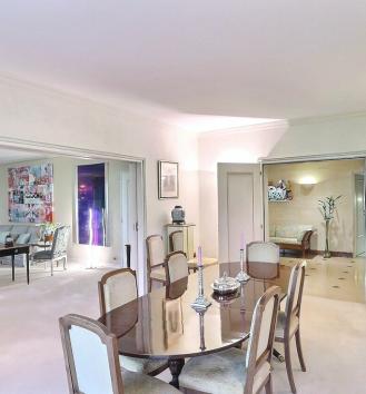 well-designed master suite, comprising two dressing rooms, two bathrooms, a boudoir and a bedroom with access to the garden. The fully equipped kitchen and the laundry room have their own service entrance. Two large cellars and four underground parking spaces complete this exceptional property. Tha appartement results from the reunification of two lots and could again be divided into two flats according to the needs of its future buyers.