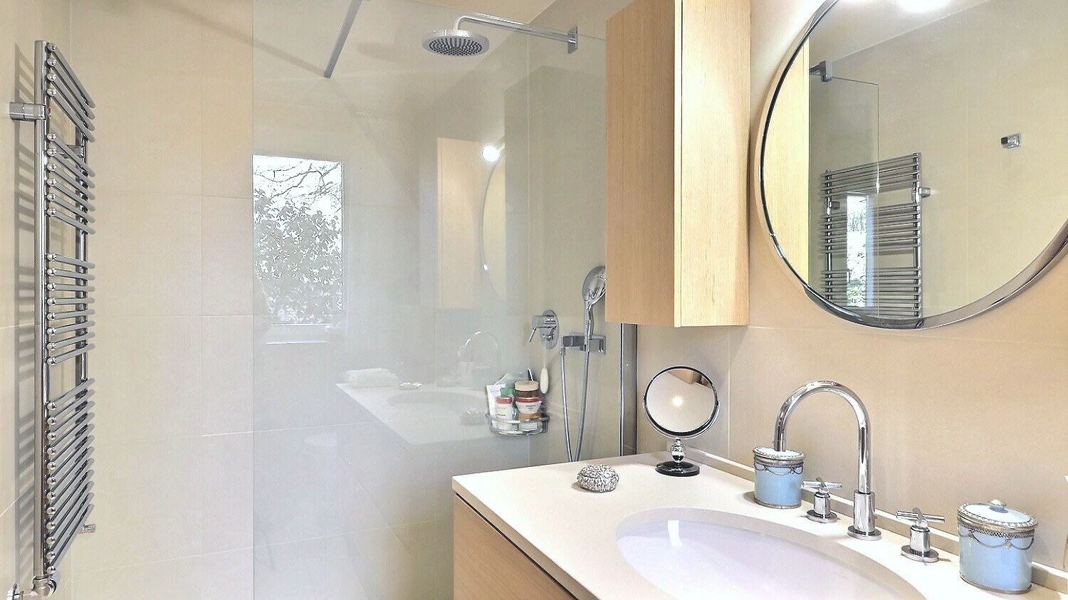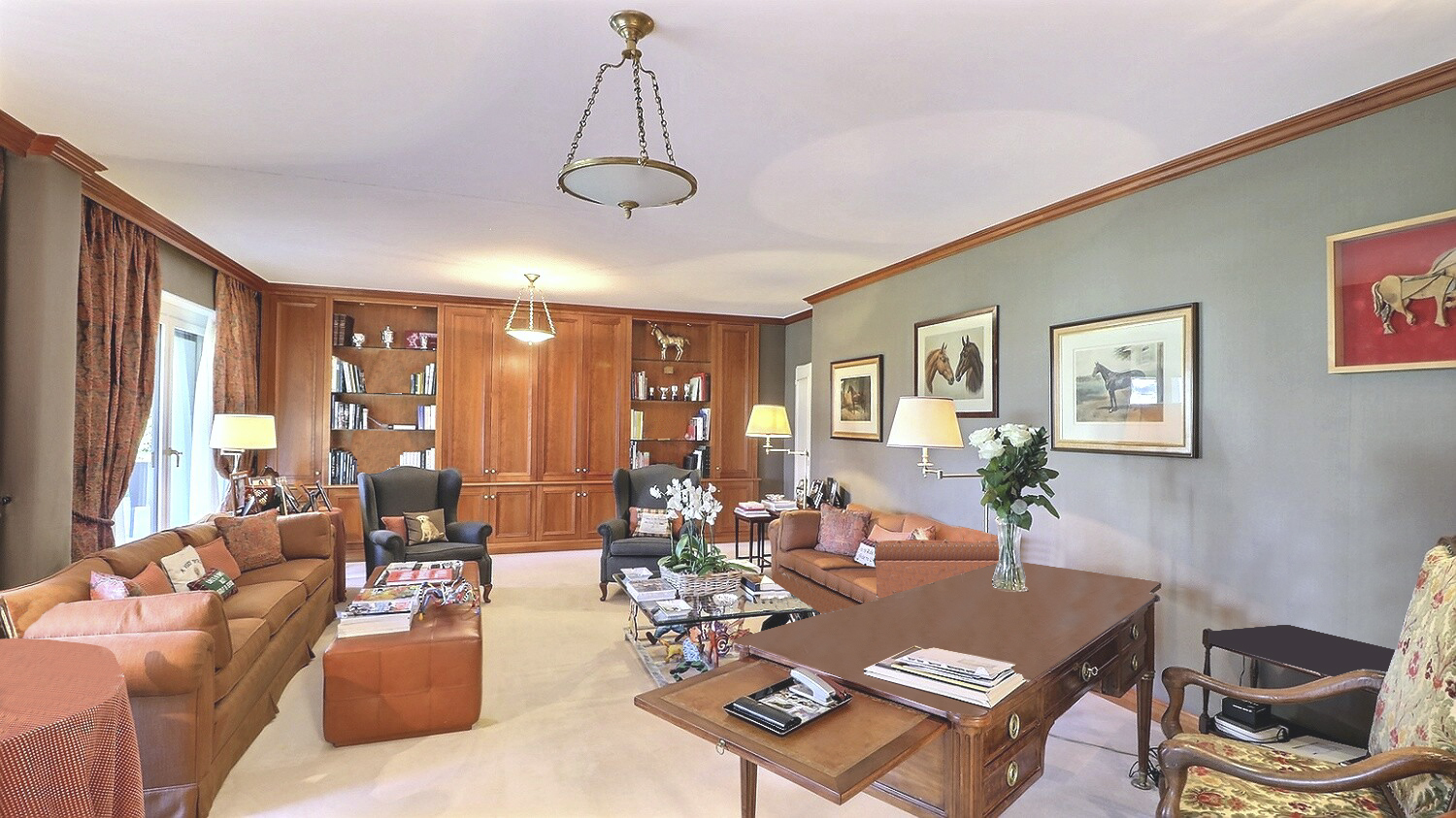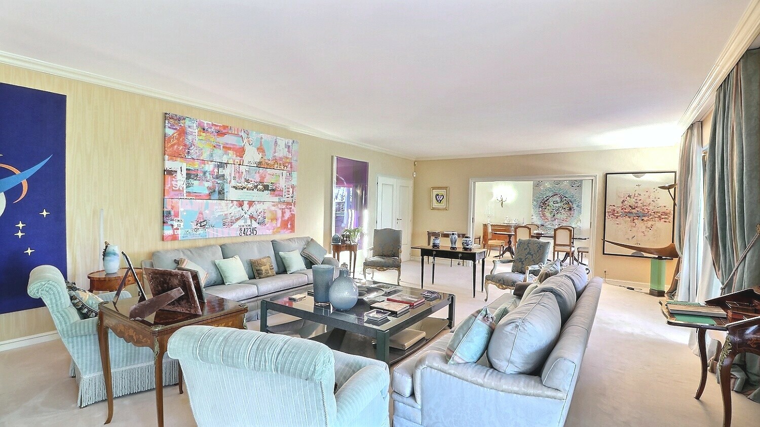 well-designed master suite, comprising two dressing rooms, two bathrooms, a boudoir and a bedroom with access to the garden. The fully equipped kitchen and the laundry room have their own service entrance. Two large cellars and four underground parking spaces complete this exceptional property. Tha appartement results from the reunification of two lots and could again be divided into two flats according to the needs of its future buyers.