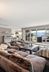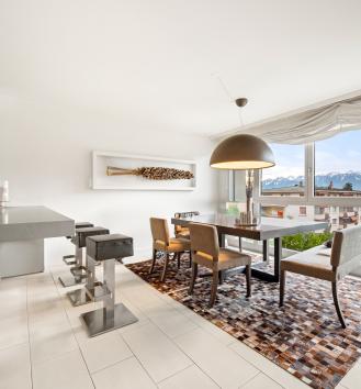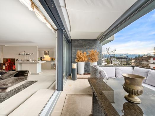 This beautiful turnkey duplex enjoys a privileged address in the heart of the highly sought-after commune of Pully. It's within walking distance of the charming center and all its amenities, the Pully-Sud train station, as well as the shores of the lake and the quays of Ouchy. The neighborhood is also appreciated for its immediate proximity to Lausanne and its excellent public transport network. The renowned Collège Champittet is just a 5-minute walk away. The 184 sqm apartment boasts contemporary, open and uncluttered architecture, with large windows and views of the Alps. Pleasant outdoor spaces extend this living space, with 32,5 sqm of balcony and terrace and a private garden of 110 sqm. The living space unfolds like a completely open plateau, offering fluid circulation between the different areas. It features a spacious living room extending onto the balcony, a fully-equipped kitchen with dining area, and a dining