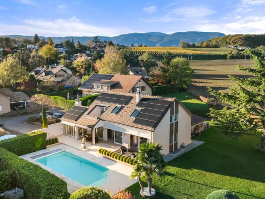 In the heart of the highly sought-after Terre Sainte neighbourhood, close to Nyon, this beautiful villa enjoys a privileged location just a stone's throw from the lake shore, international schools and all amenities. Completely renovated and in perfect condition, the villa charms with its brightness, generous proportions and privileged setting. This beautiful house offers a total surface area of 350 m² spread over two levels, as well as a fully converted basement. The ground floor features a series of adjoining living rooms: a dining room and lounge with fireplace, bathed in light thanks to large bay windows overlooking the garden. The spacious kitchen, fully equipped, extends into a veranda, offering a space of 45 m². Upstairs, four bedrooms, including a beautiful master suite with en-suite bathroom, solarium and lake views, make up the sleeping area. The fully converted basement offers multiple spaces: fitness room
