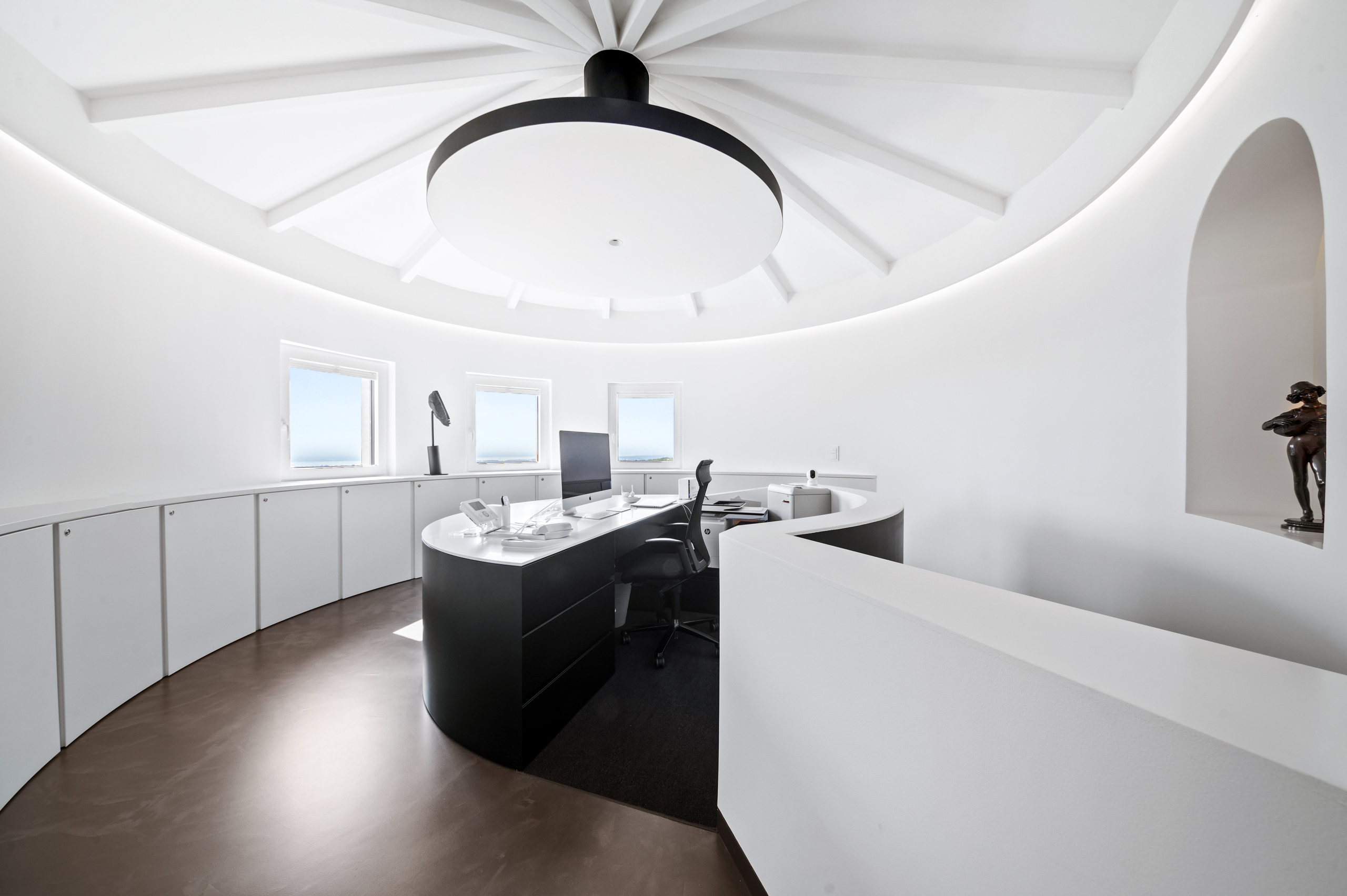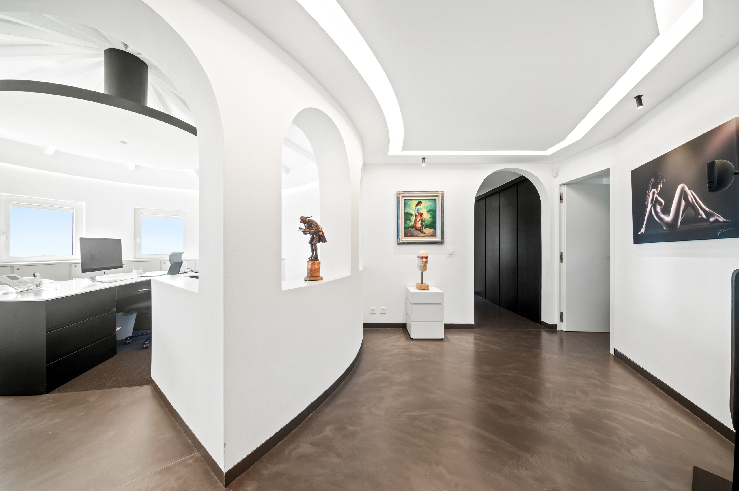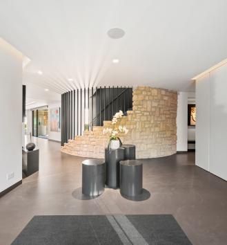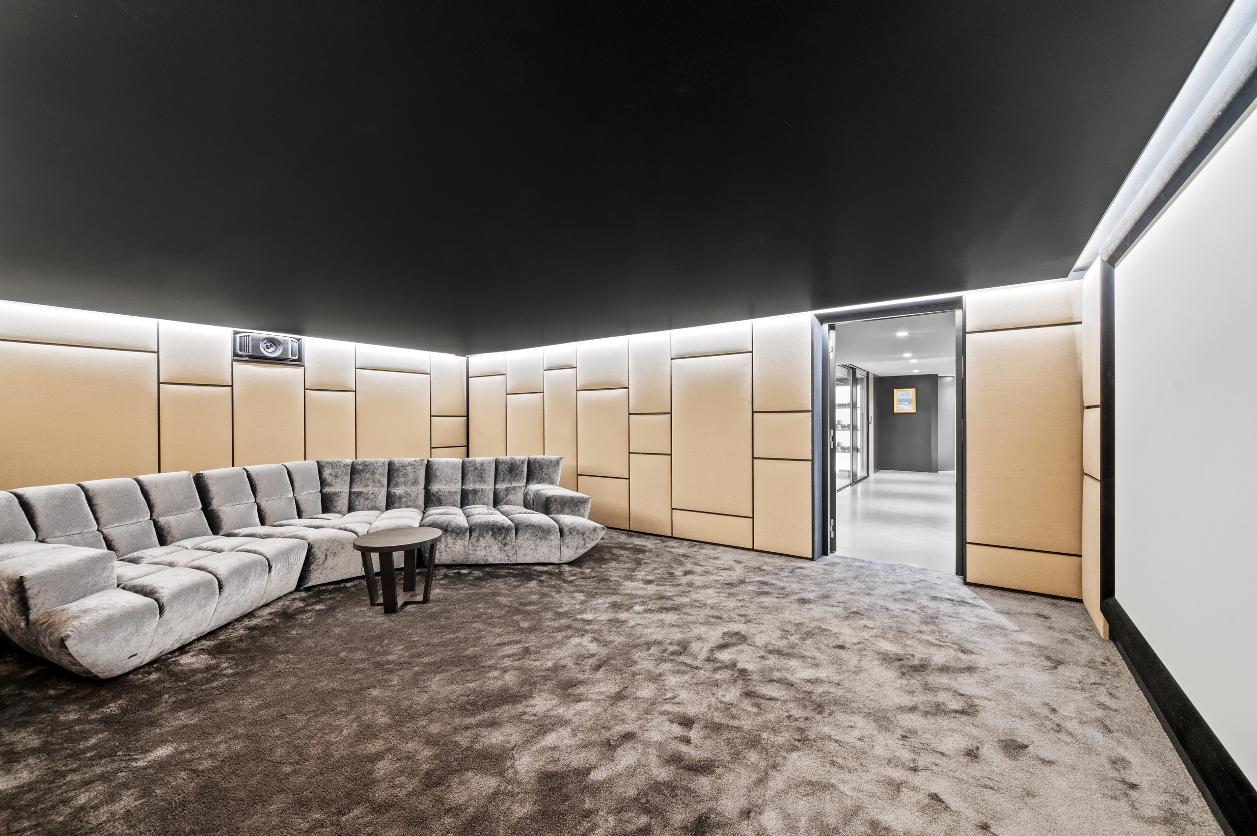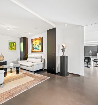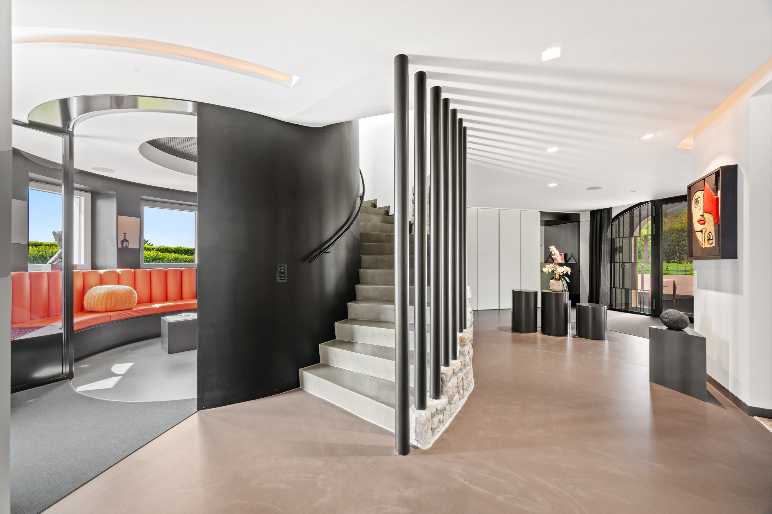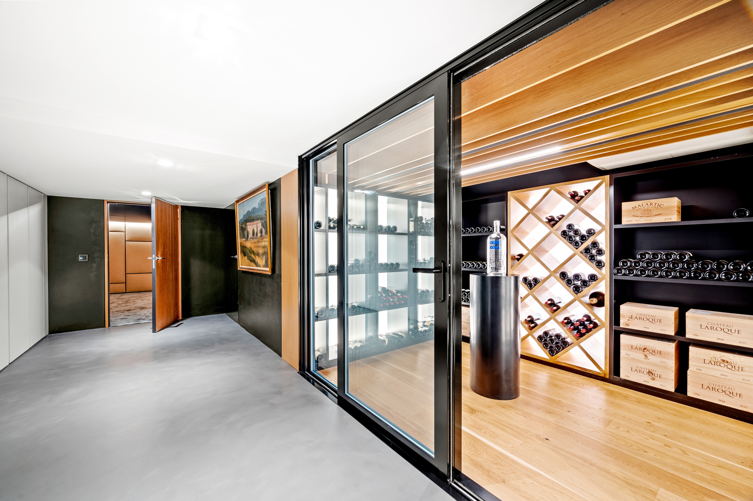 The basement is decidedly exclusive: a glass-fronted, air-conditioned wine cellar, secure bunker, home cinema, cellar and technical rooms are laid out in a practical and refined manner.
