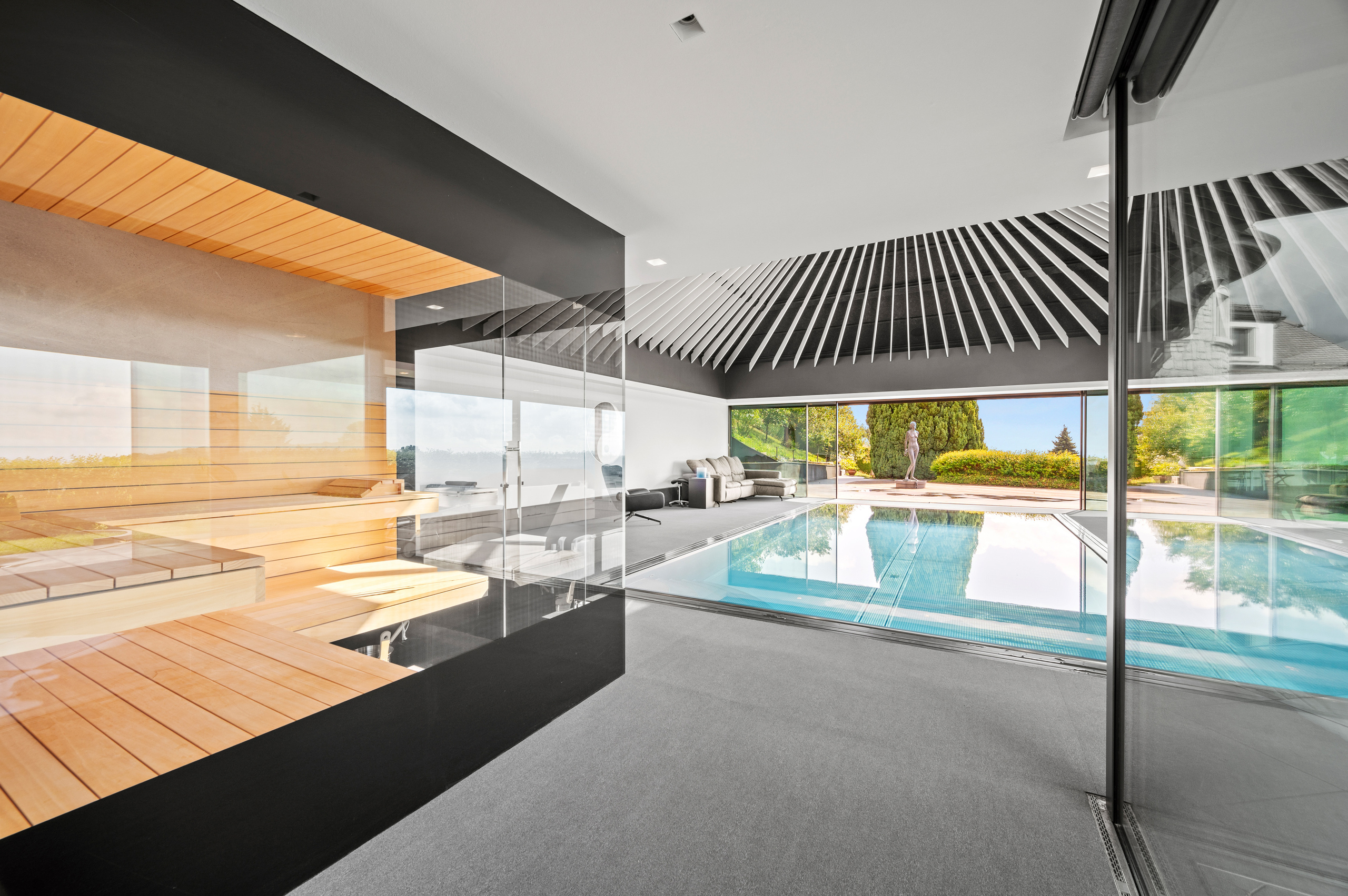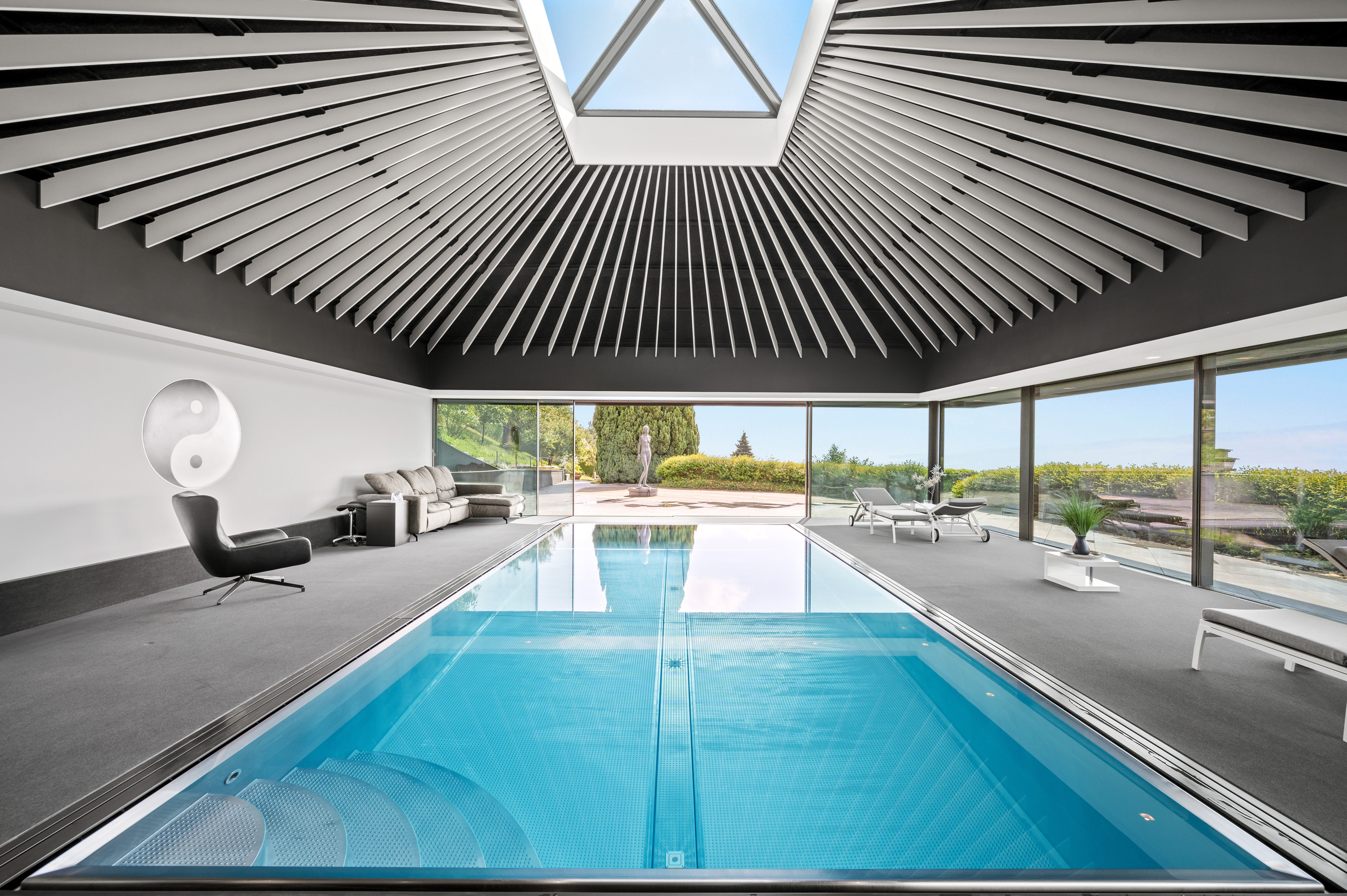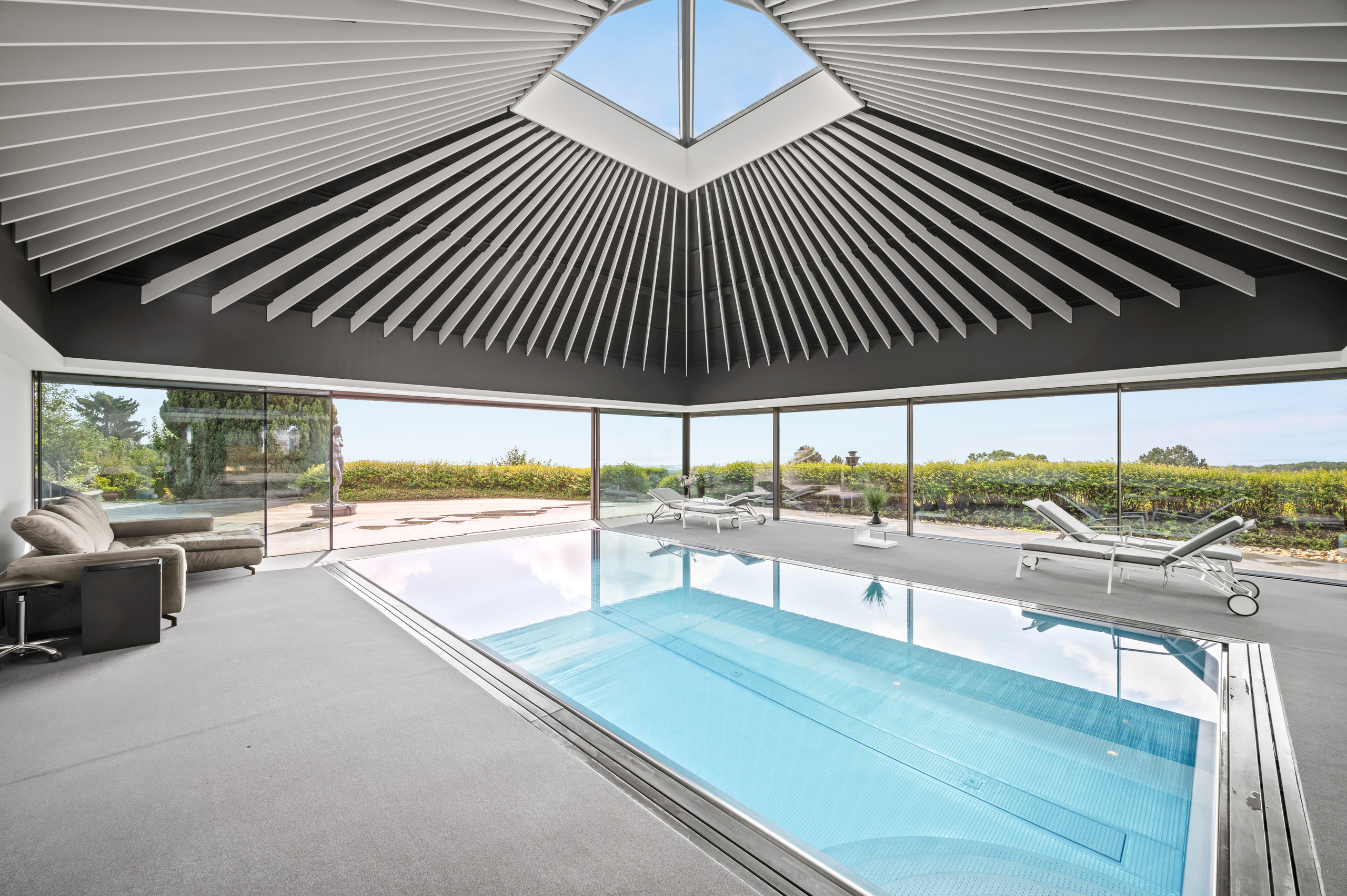 The ground floor also offers a unique experience: a wellness area featuring an indoor stainless steel counter-current swimming pool, a sauna, a hammam and a shower. The whole area is bathed in light thanks to the bay windows and opens directly onto the garden. An independent studio with its own entrance completes this level and offers total autonomy to its occupants.