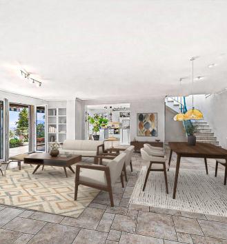 un salon, une cuisine ouverte, trois chambres et trois salles de bains dont une avec baignoire balnéo.