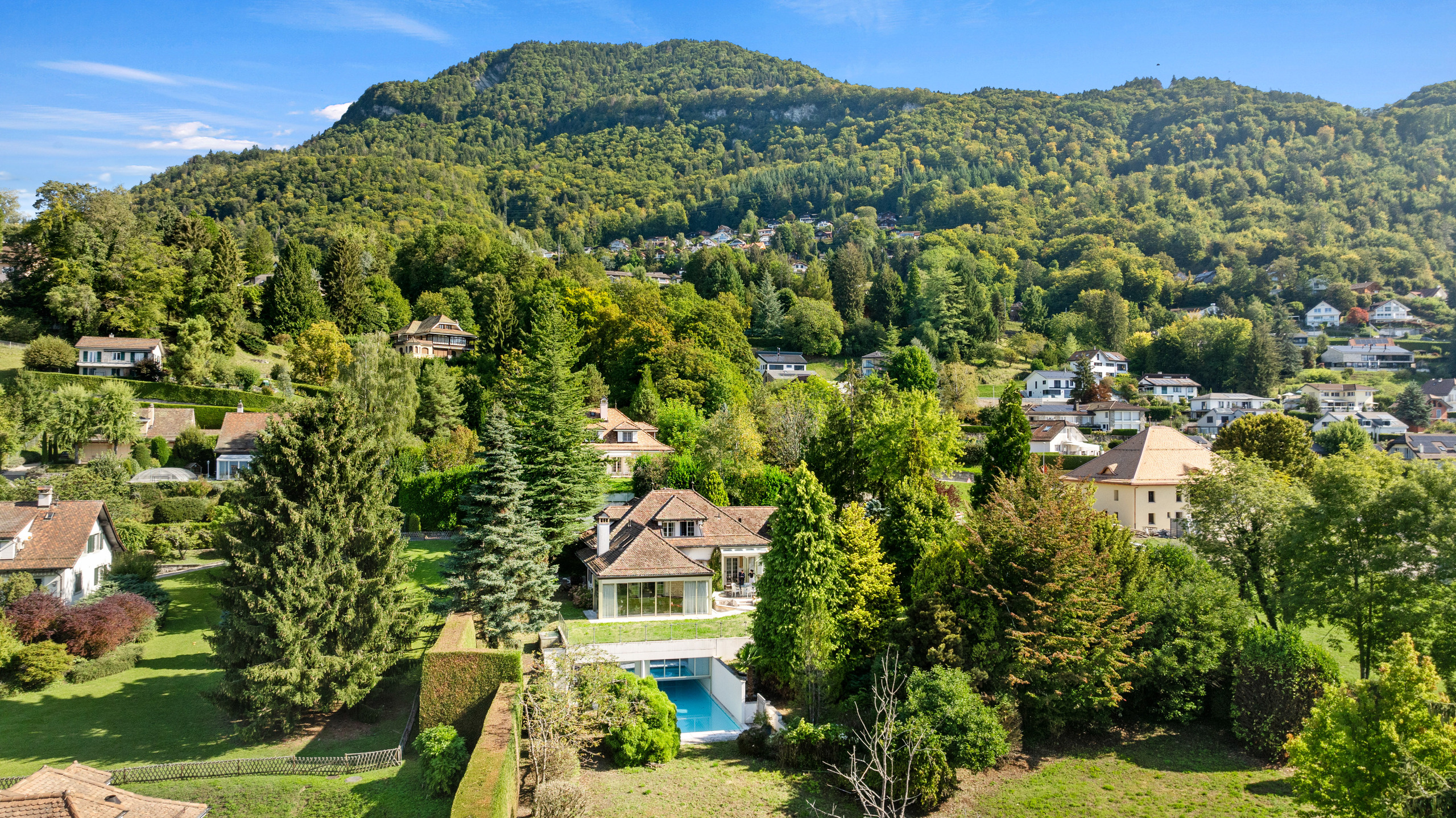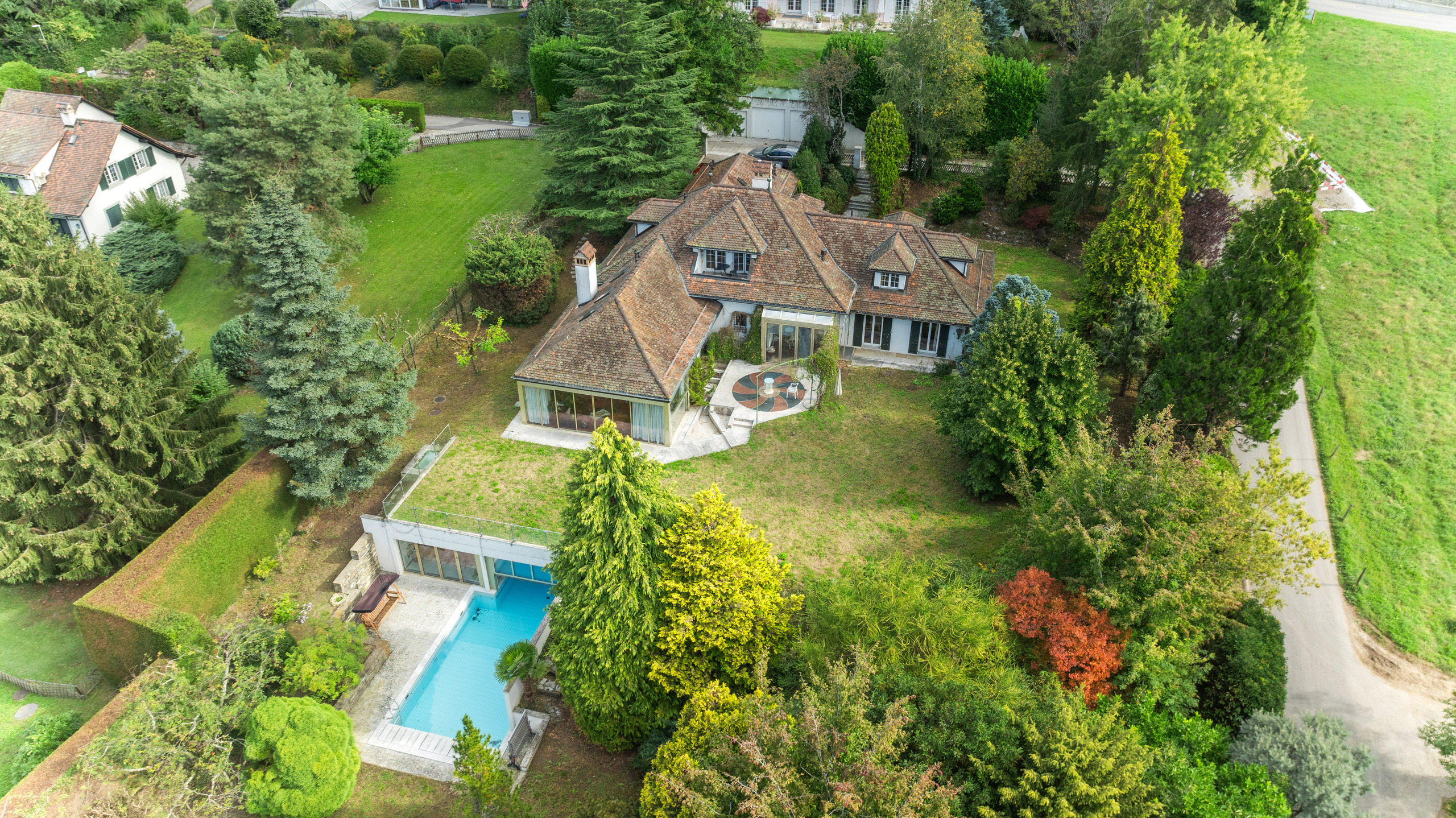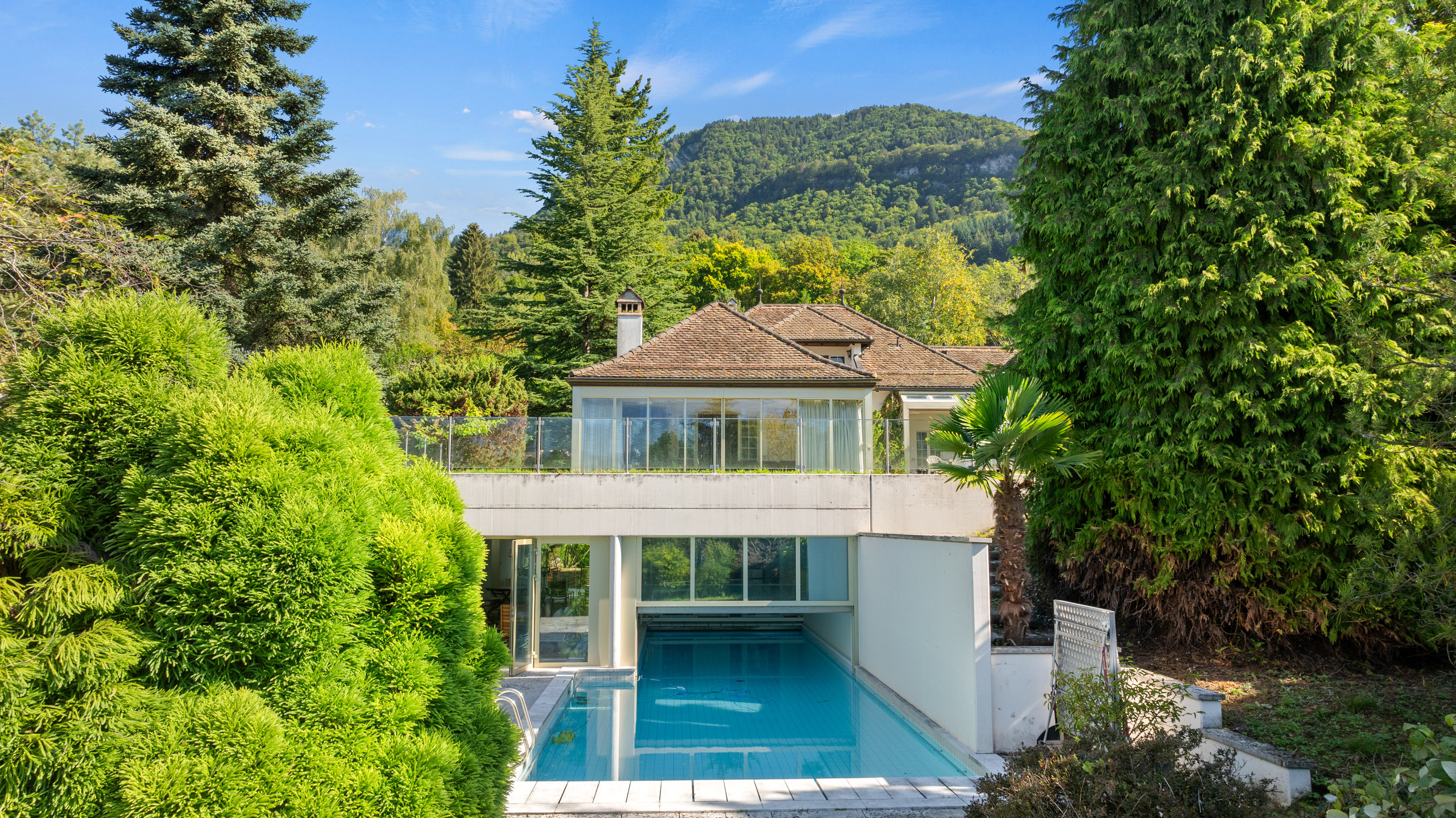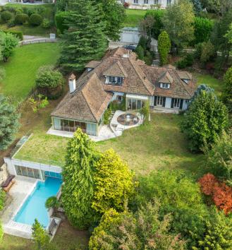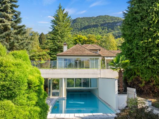 Cette propriété familiale est située dans un quartier résidentiel de Saint-Légier tout proche des commerces, des transports et des écoles internationales. Classique, élégante et proposant des vastes volumes intérieurs, elle a été construite en 1977 avec de très beaux matériaux mais nécessite une remise à jour et des travaux. Sa parcelle de 4'224 m2 apporte une grande privacité et propose une variété dessences d'arbres dans un décor intimiste et verdoyant. D'une surface habitable de plus de 500 m2, elle distribue deux niveaux et un vaste rez inférieur desservis par un ascenseur. Elle comprend des très grandes pièces de réception avec des accès extérieurs sur le jardin, trois suites avec dressing et salles de bains, deux autres chambres, un bureau. Une zone spa, une piscine moitié intérieure (8x4 m)et extérieure (10x5 m) avec accès sur le jardin, un très grand bureau, des caves et locaux techniques complètent