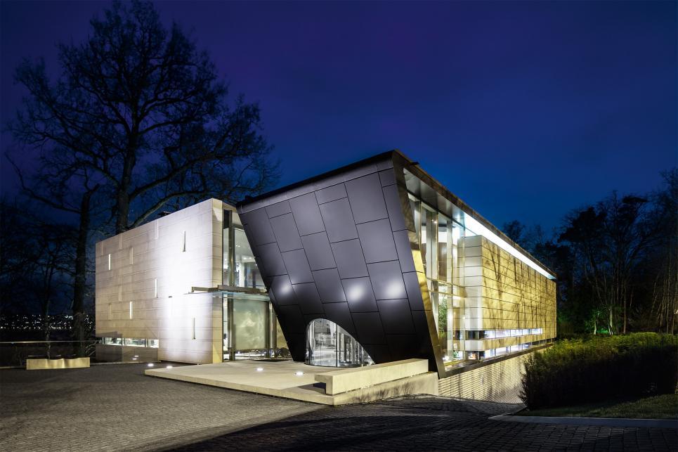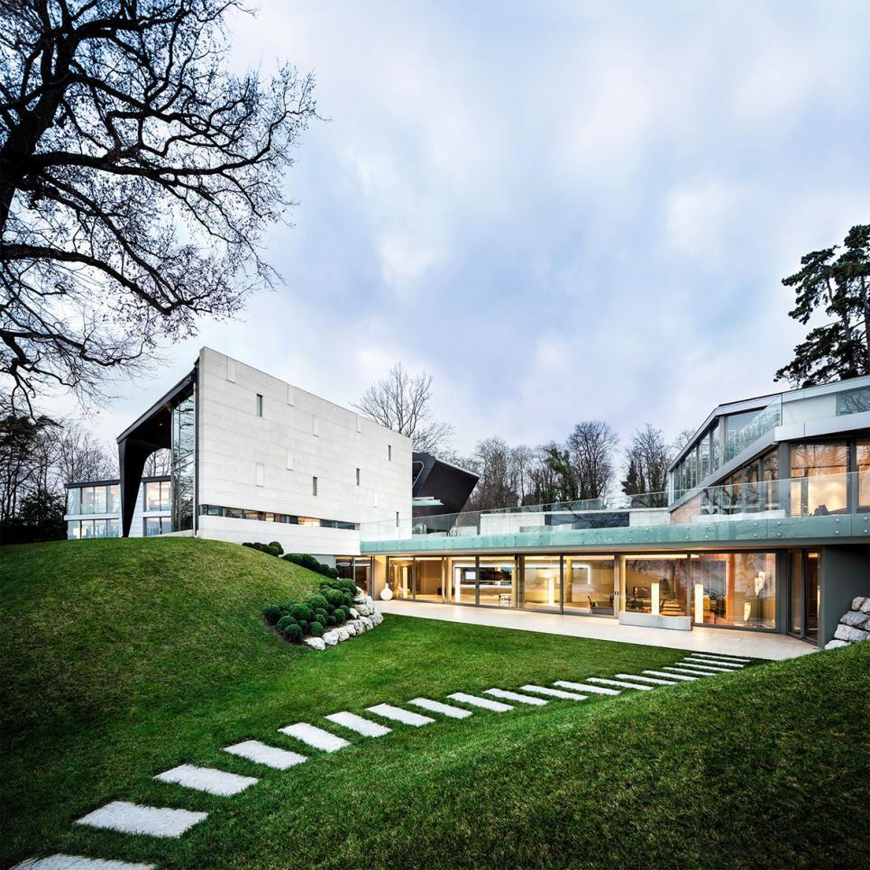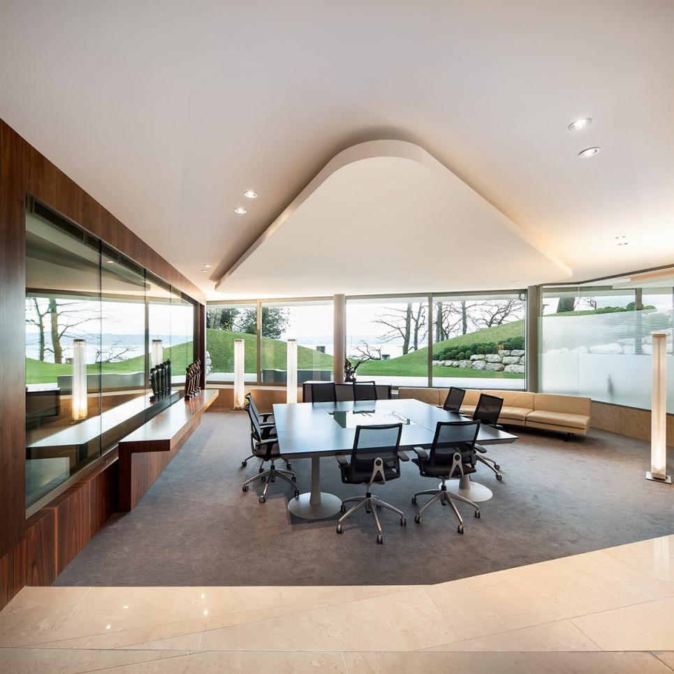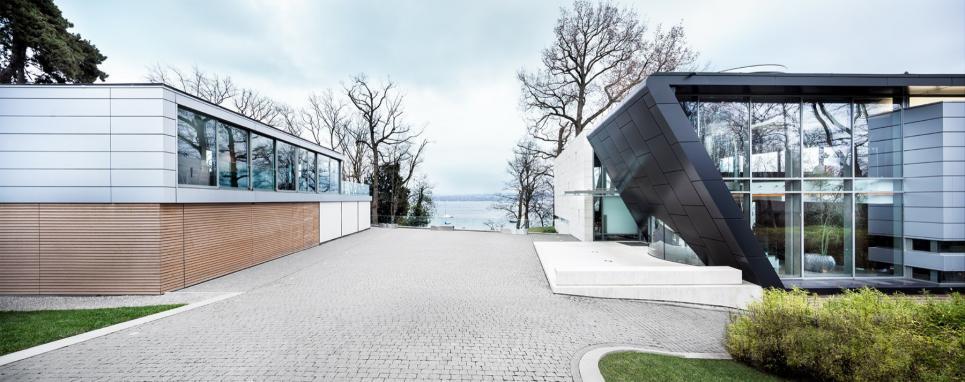 Jouissant d’un emplacement exceptionnel sur les rives du lac Léman, proche des organisations internationales et de l’aéroport, cette propriété aux lignes sculpturales et puissantes dispose d’une surface de 1’772m2 répartie dans un bâtiment principal, d' une annexe et d'un modeste bâtiment classé. Ce remarquable ensemble aux bords arrondis et aux lignes triangulaires arbore une architecture imposante et contemporaine qui mise sur la transparence pour dévoiler l’extraordinaire vue sur le Mont Blanc et le lac. Dans l’édifice principal le vaste hall d’entrée distribue les spectaculaires pièces de réception. Celles-ci sont composées d’un salon aux impressionnantes hauteurs sous plafond, d’une salle à manger, d’une superbe cuisine équipée et d’un second salon familial, le tout prolongé par une grande terrasse qui domine le lac. Le premier étage accueille l’espace nuit. Il se compose de la splendide suite parentale avec son généreux dressing et sa salle de bain attenante,