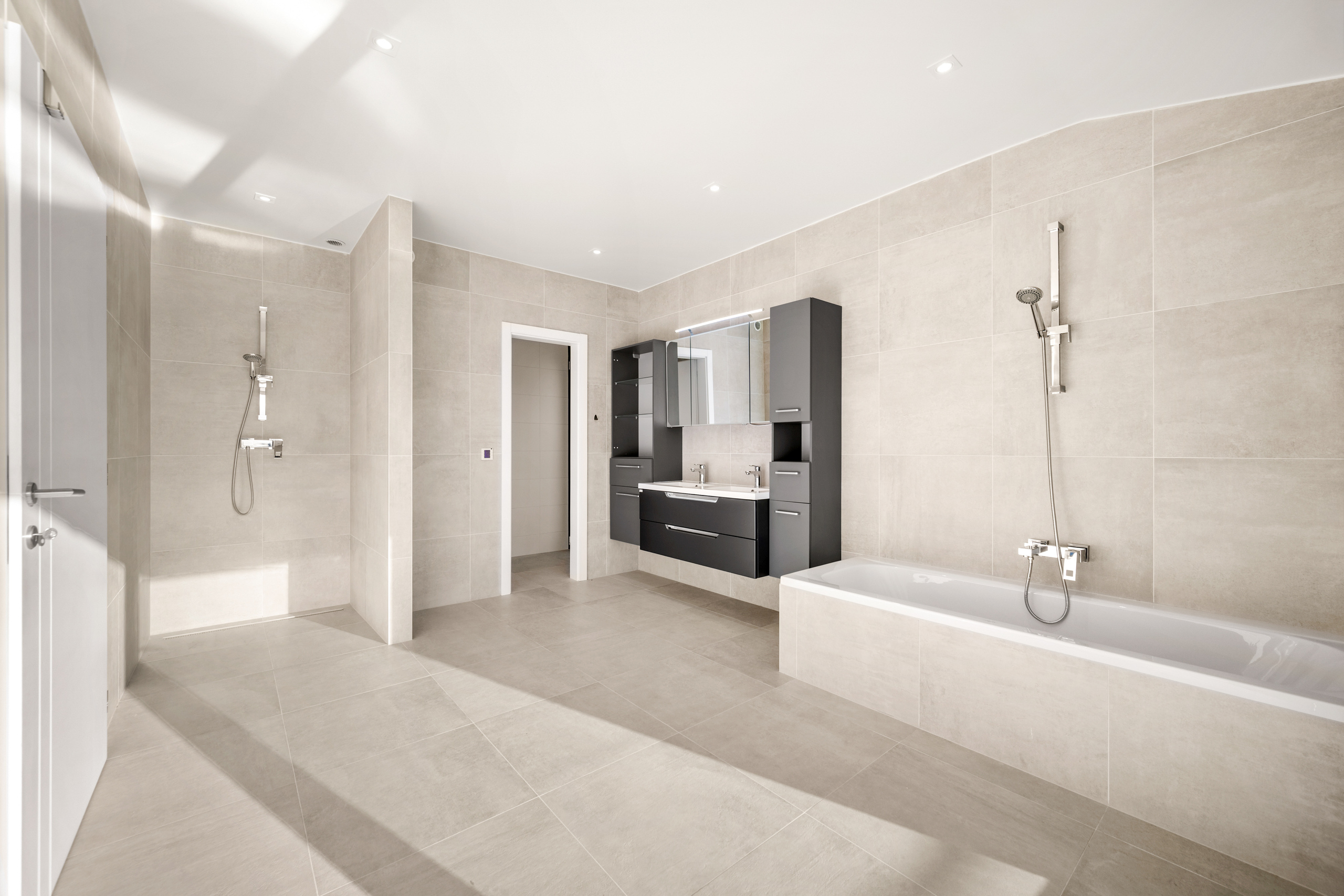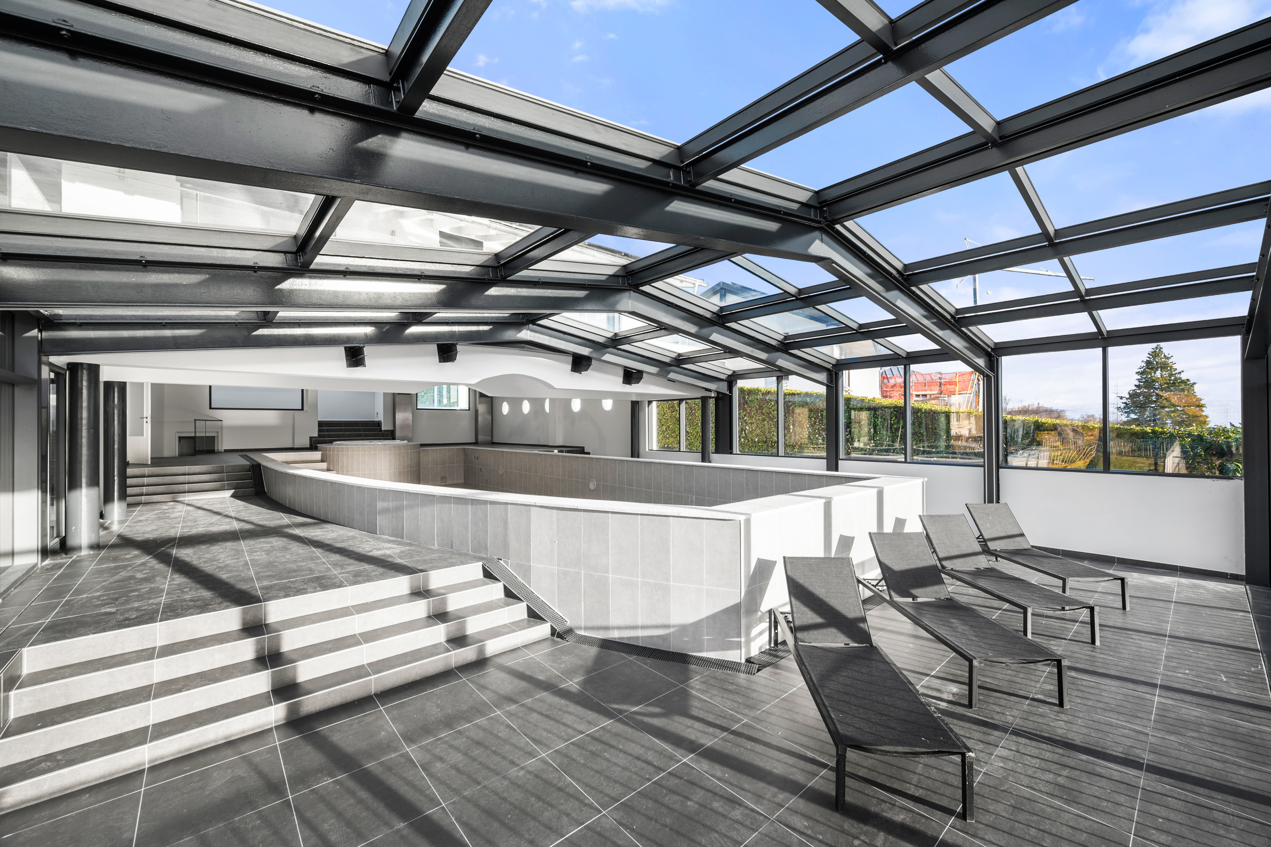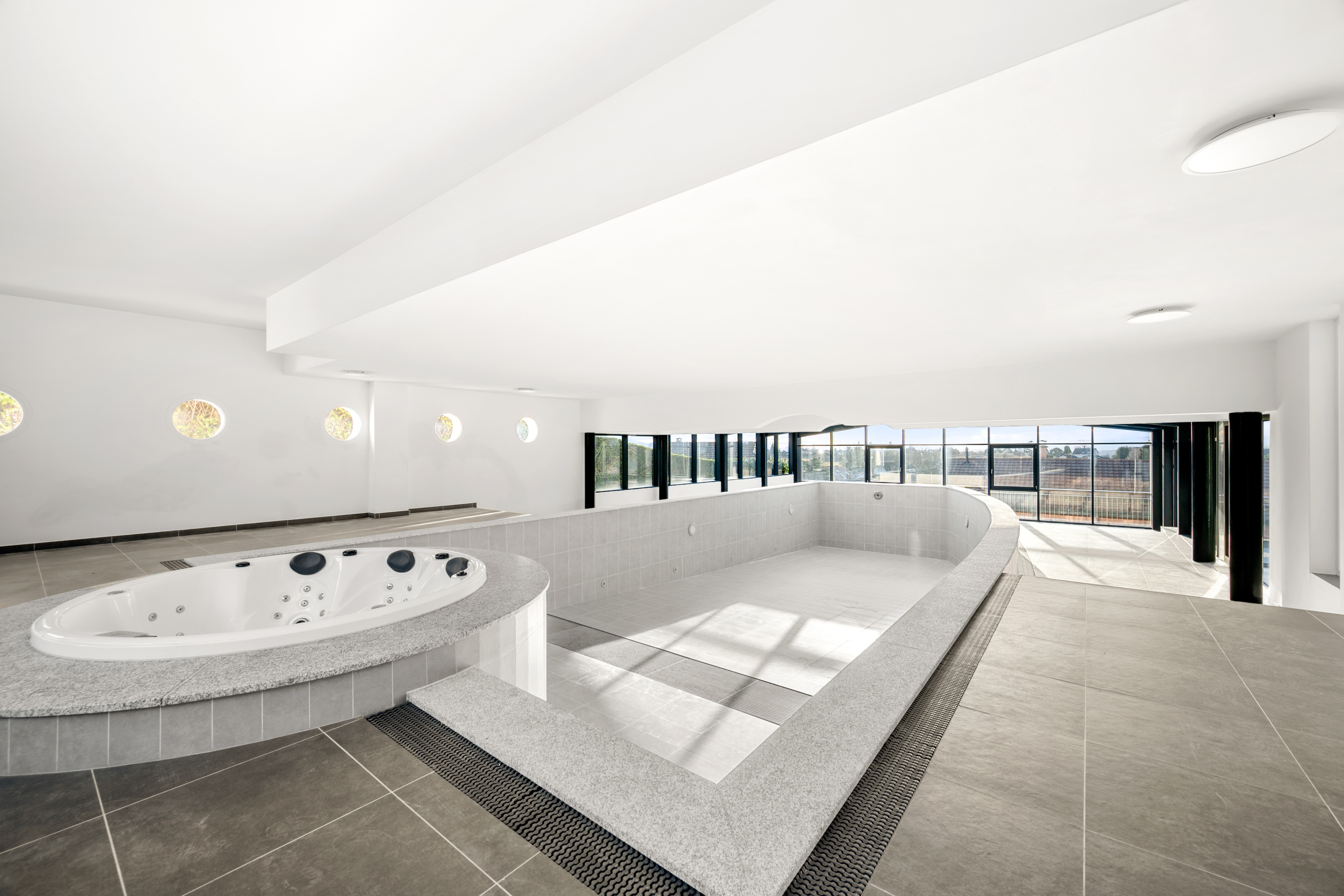 accessible depuis la piscine et le jacuzzi, une partie du niveau inférieur est dédiée au bien-être, comprenant deux douches, un sauna et un hammam, formant un véritable spa privé. Ce même niveau propose également de vastes espaces polyvalents, parfaits pour un home cinéma, une salle de sport ou un espace de loisirs, ainsi qu’une buanderie et des locaux techniques.